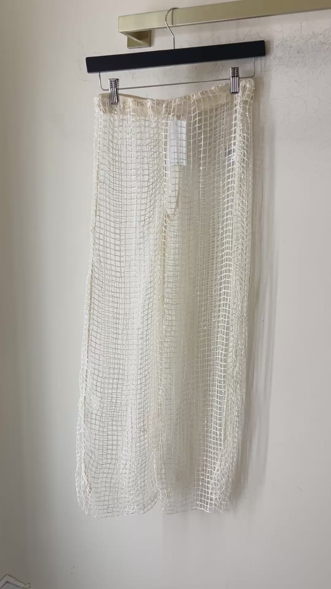 Clothing Features: Sheer net fabric with grid pattern, allover sequin embellishment, relaxed wide-leg fit, elastic waistband, unlined, high rise